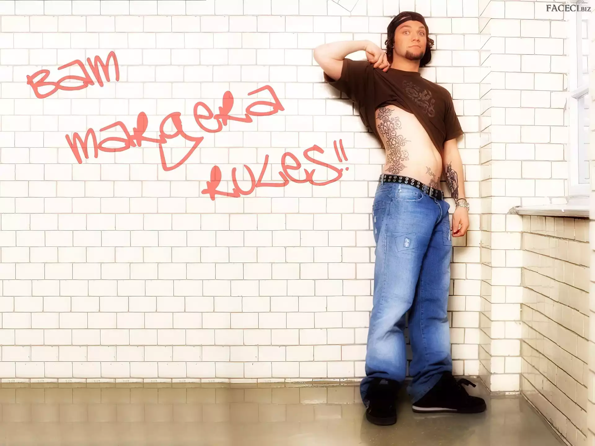 t-shirt, Bam Margera, brązowy okulary, Bam Margera, butelka włosy, Bam Margera, ciemne okulary, Bam Margera, twarze kurtka, Bam Margera, rozpięta zegarek, Bam Margera, deskorolka